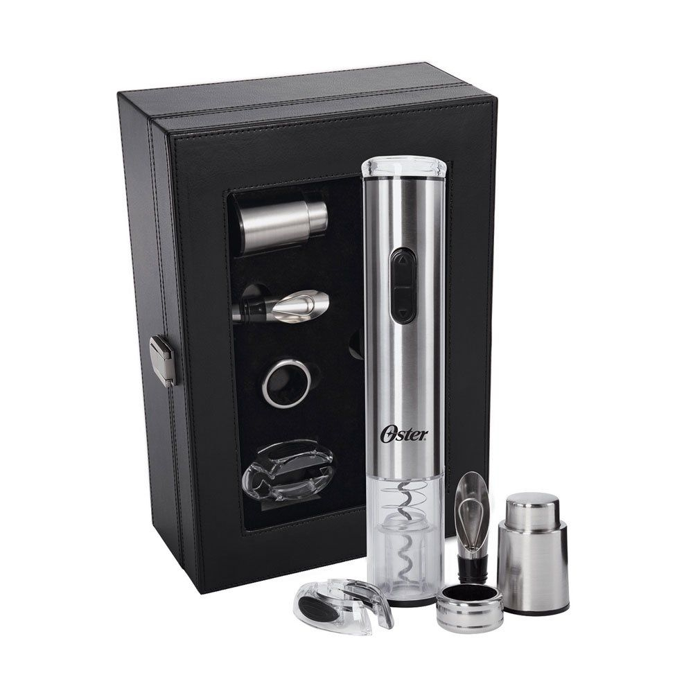 Chegou a hora de você servir um bom vinho! O conjunto para vinho da Oster vem em um moderno e prático estojo que acomoda todos os acessórios. Possui um sofisticado abridor elétrico de vinho em aço inoxidável que funciona com 4 pilhas pequenas AA apertando apenas um botão.